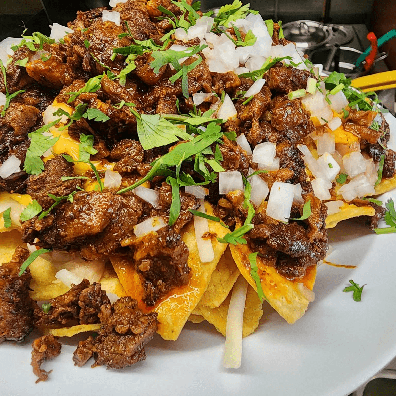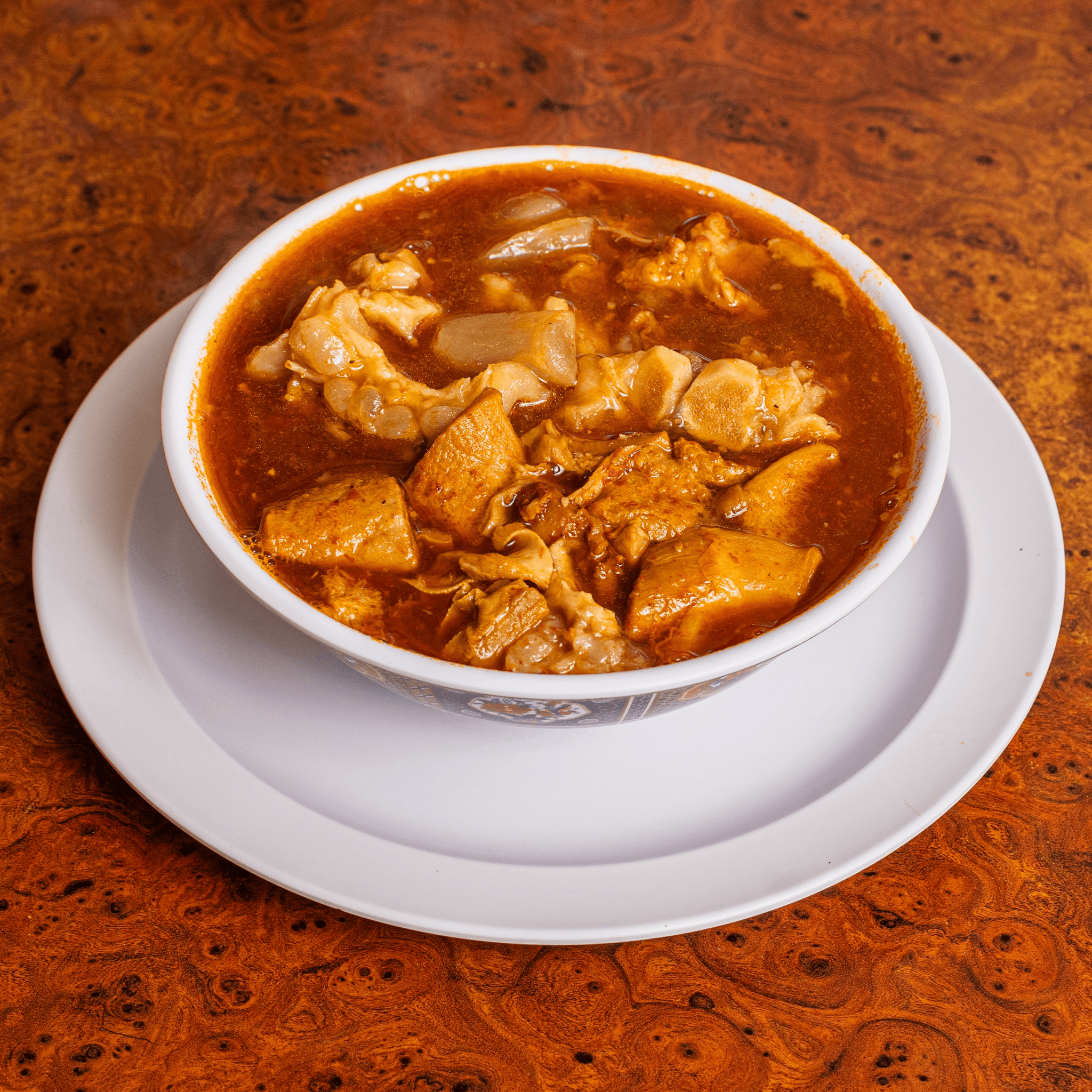 Tripe soup and the inclusion of your choice. Served in our flavorful soup, Pata (foot), nervio (nerve) and grano (hominy). Onions, cilantro, crushed chili peppers, lemons, oregano, and four (4) corn tortillas served on the side