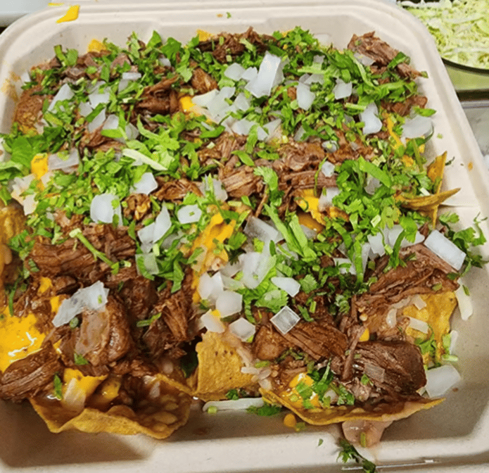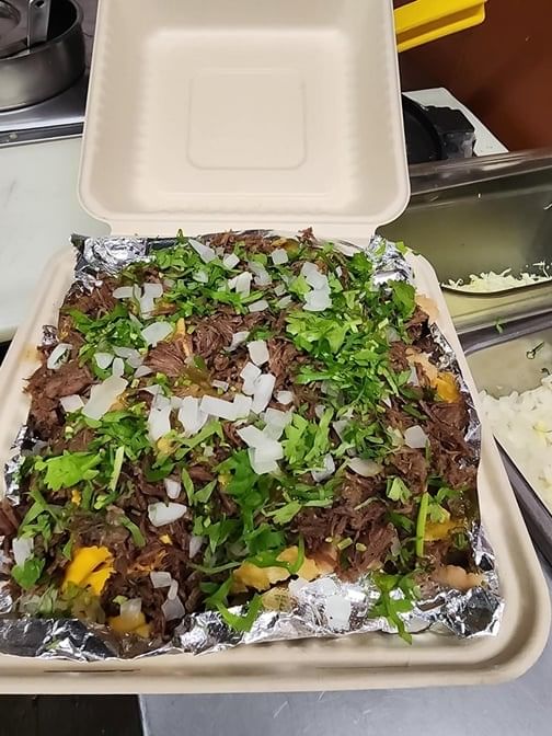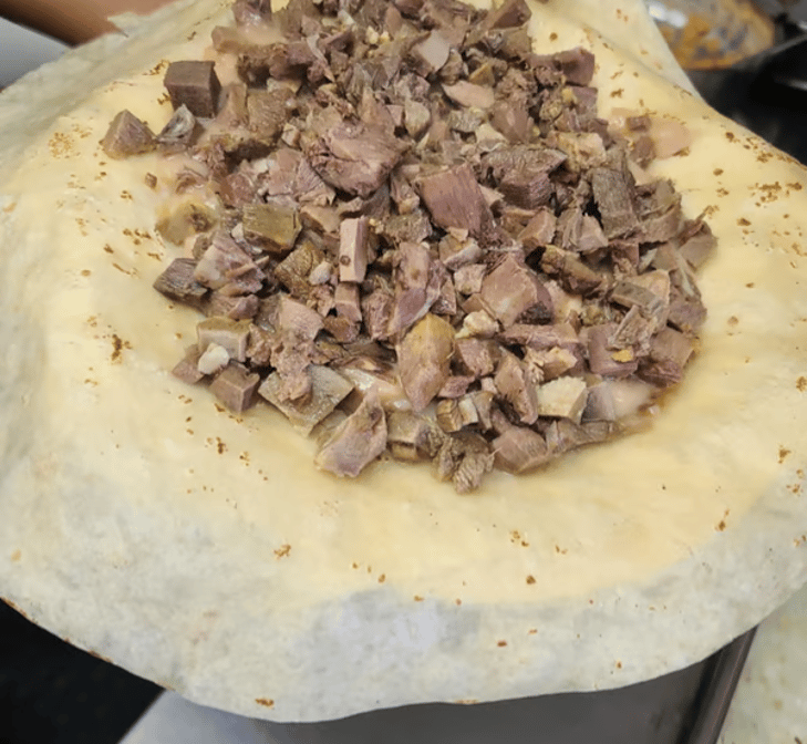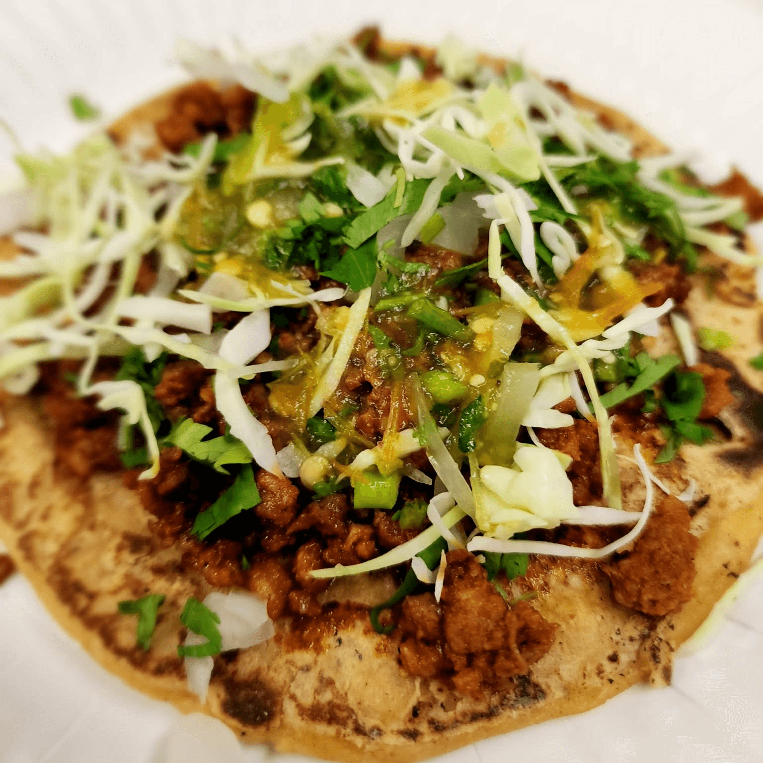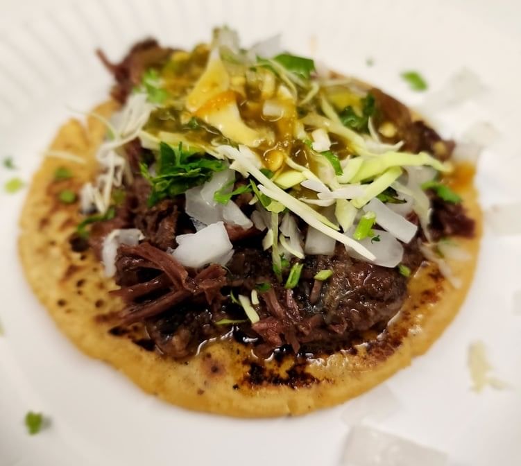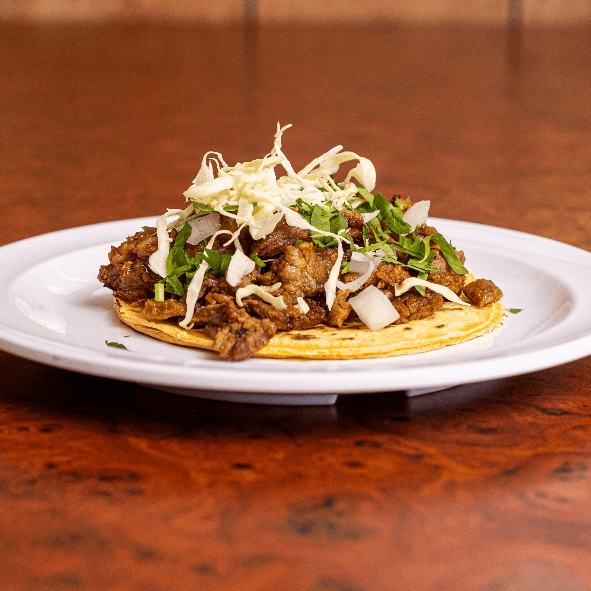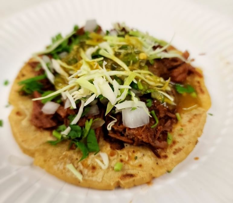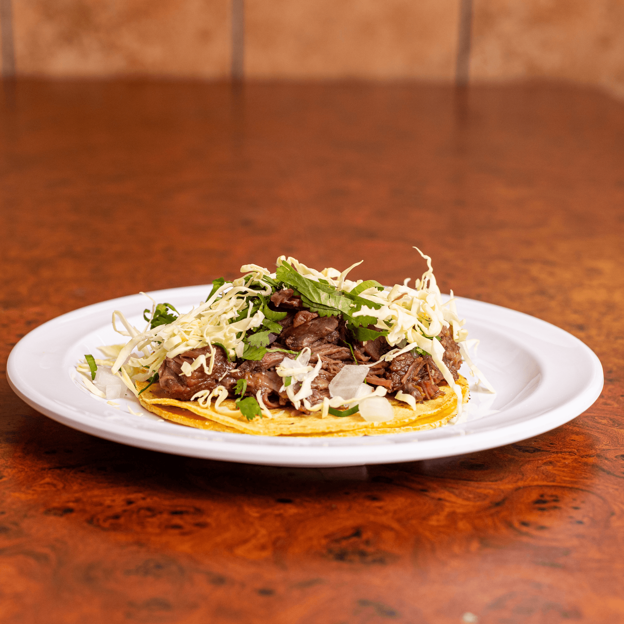 Beef stew. Served on a large handmade tortilla with plenty of meat, onions, cilantro, cabbage, beans, cheese and our signature green sauce. Radishes, cucumber, and lemons are served on the side