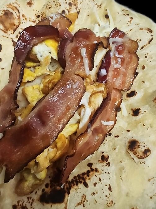 Wrapped in a flour tortilla, our Bacon Breakfast Burrito is served with eggs, flavorful refried beans, Monterey Jack cheese, onions, cilantro, cabbage, and our signature green sauce. Radishes, cucumber, and lemons are included on the side