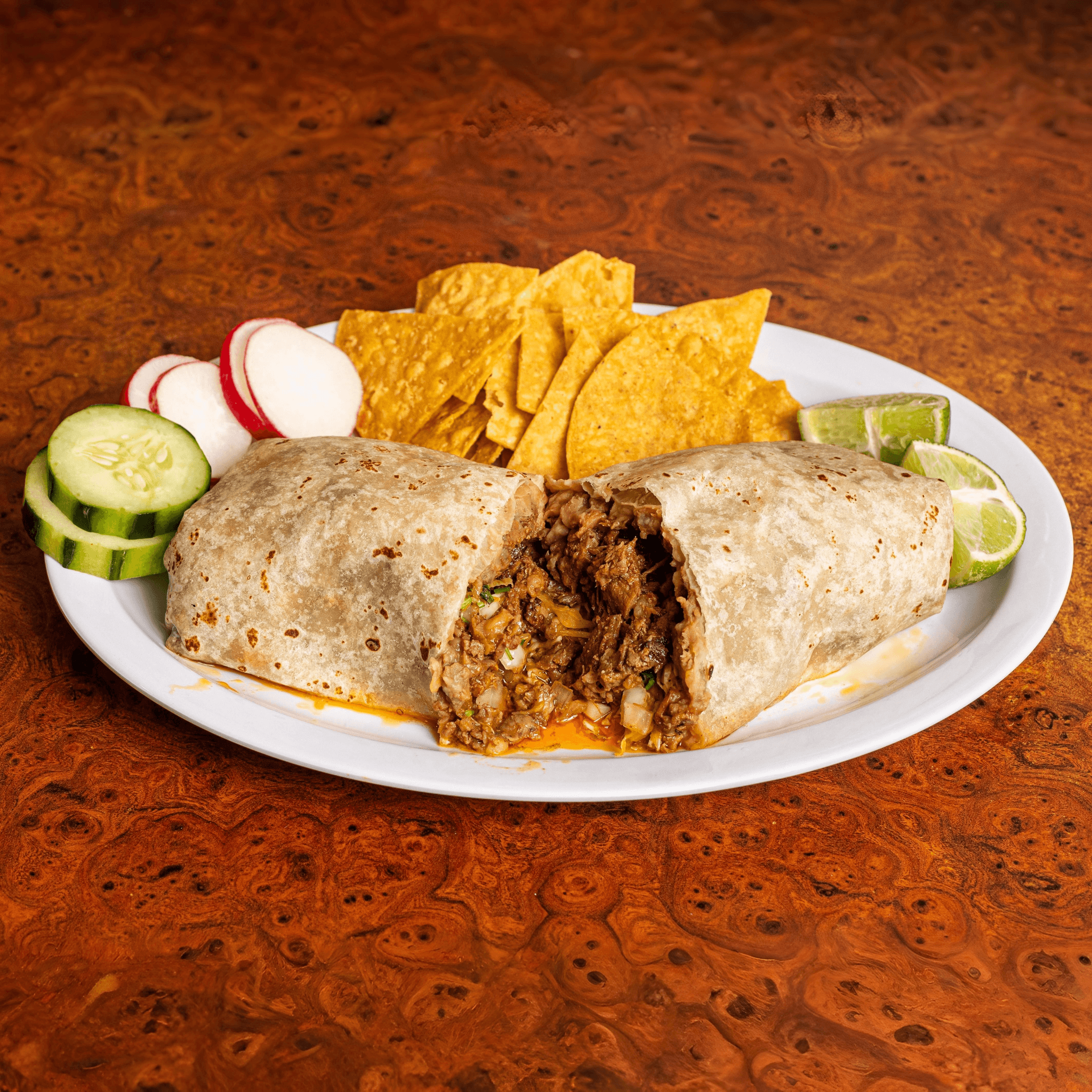 Marinated pork. Wrapped in a flour tortilla, our burritos are served with flavorful refried beans, onions, cilantro, cabbage, and our signature green sauce. Radishes, cucumber, and lemons are included on the side