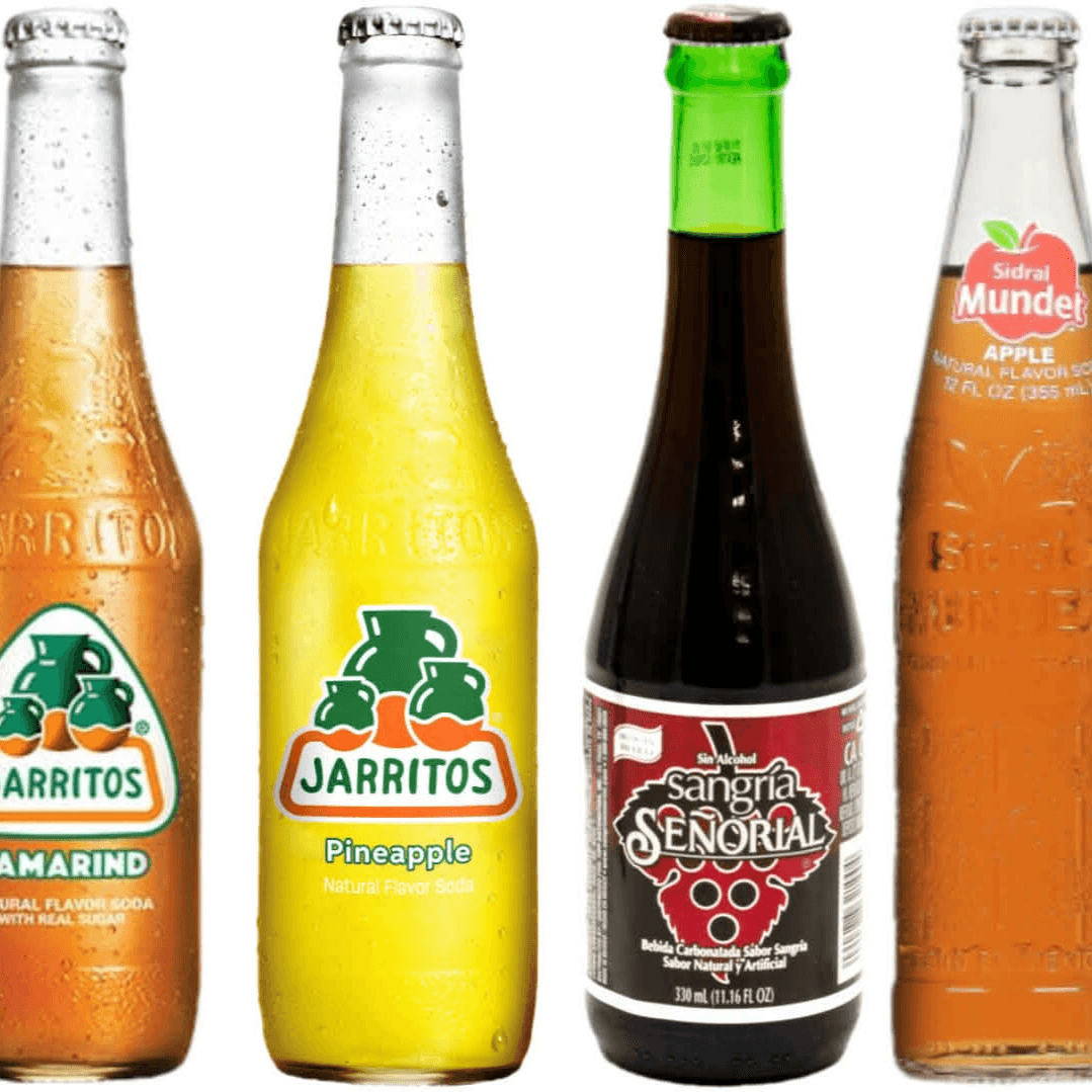 Mexican bottled soda. Choices include Sidral, Sangria, various Jarrito flavors like Pineapple, Tamarind, and Mandarin