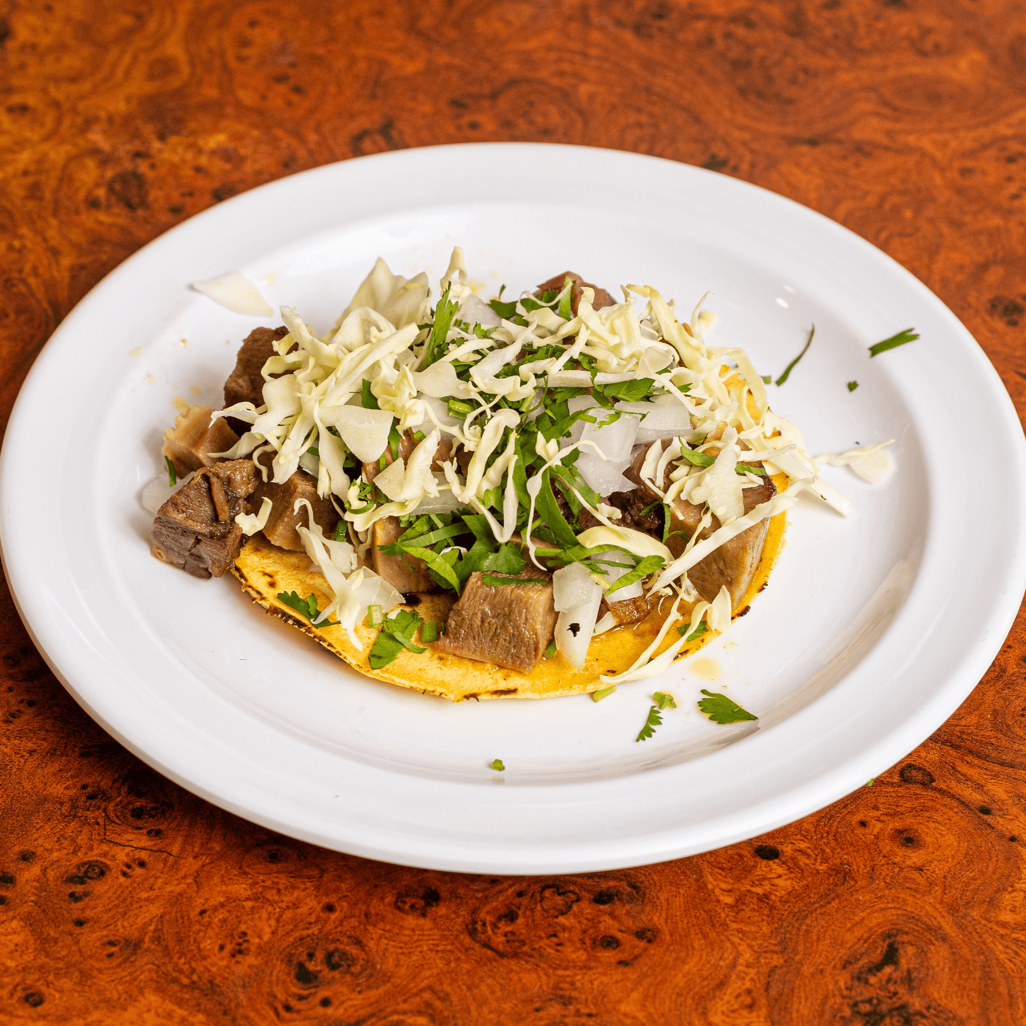 Tongue. Served on a large handmade tortilla with plenty of meat, onions, cilantro, cabbage, beans, cheese and our signature green sauce. Radishes, cucumber, and lemons are served on the side