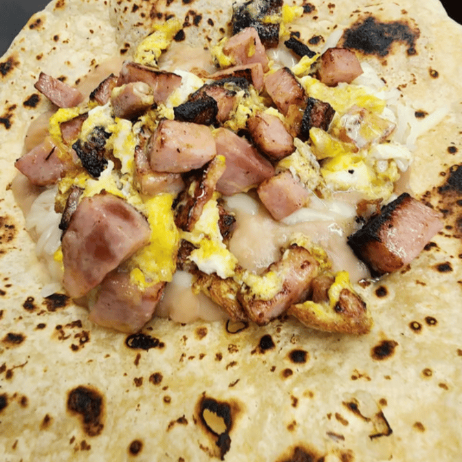 Wrapped in a flour tortilla, our Ham breakfast burritos are served with eggs, flavorful refried beans, Monterey Jack cheese, onions, cilantro, cabbage, and our signature green sauce. Radishes, cucumber, and lemons are included on the side