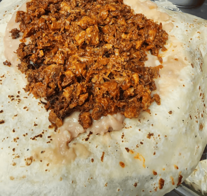 Tongue. Wrapped in a large flour tortilla, our burritos feed 1 to 2 and are served with flavorful refried beans, onions, cilantro, cabbage, and our signature green sauce. Radishes, cucumber, and lemons are included on the side