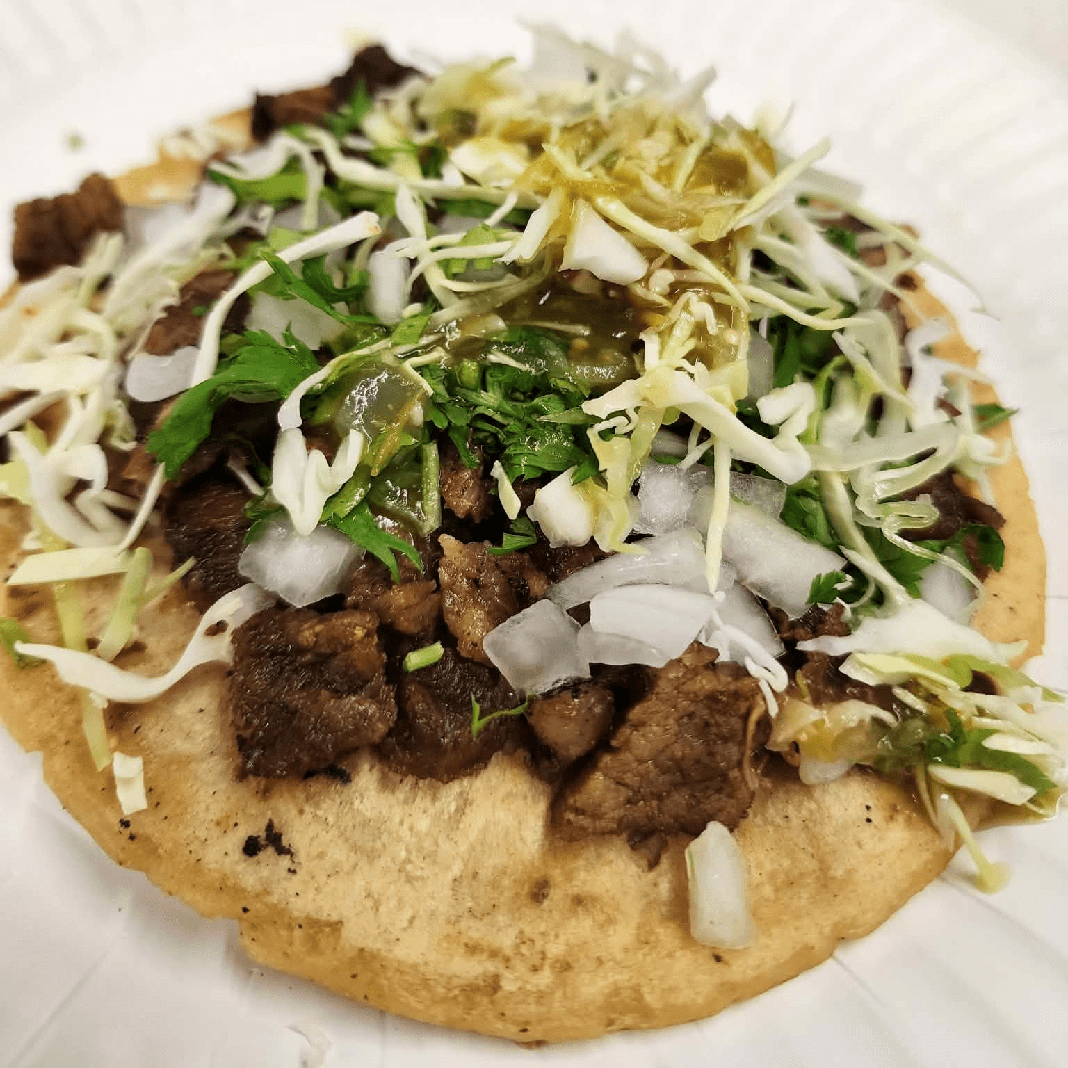 Steak. Served on a large handmade tortilla with plenty of meat, onions, cilantro, cabbage, beans, cheese and our signature green sauce. Radishes, cucumber, and lemons are served on the side